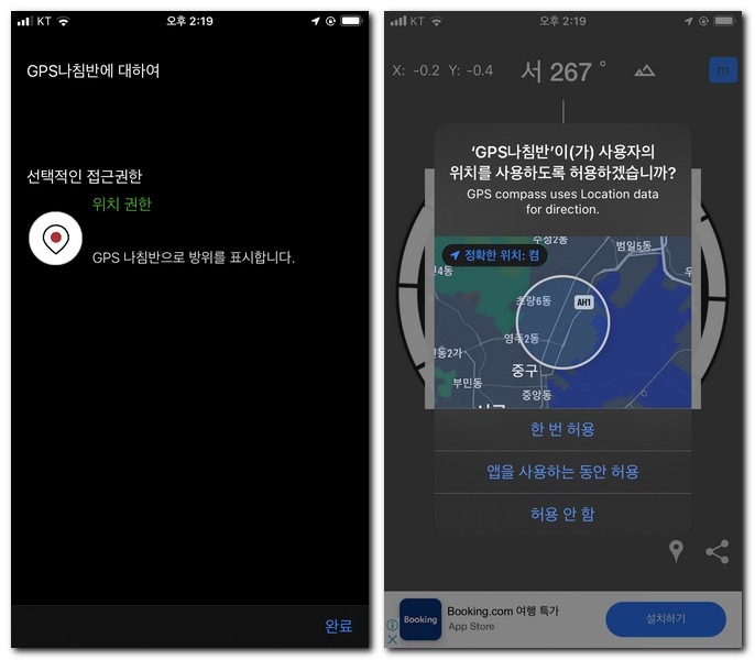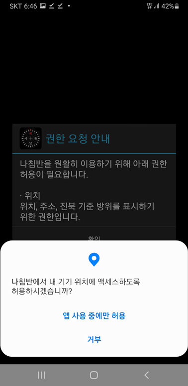 나침반 앱은 특성상 위치 정보 권한을 요구하게 됩니다.