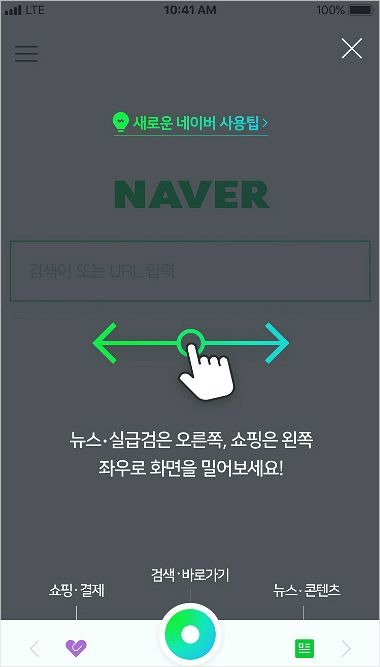 오른쪽 사이드바에 위치한 네이버 로고를 누르면 화면 전환 없이 명확하게 검색창이 열립니다.
